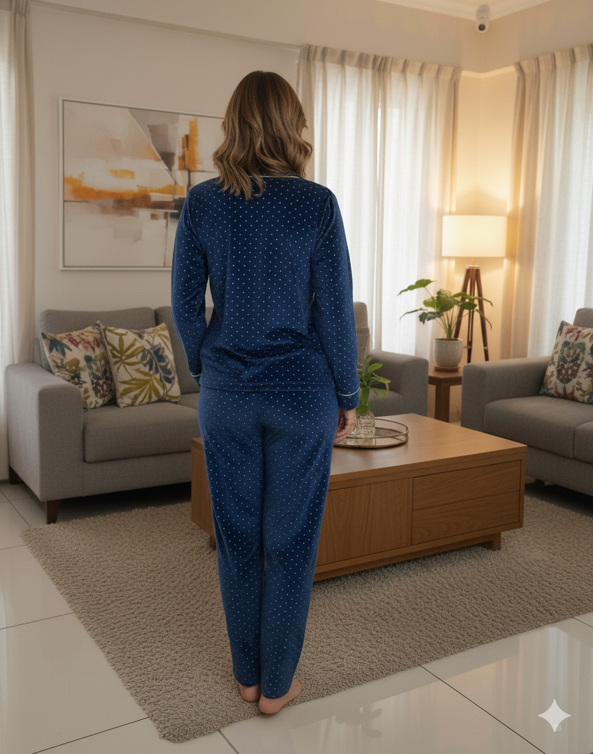 Featuring a front-open top with a classic notch collar and full sleeves, paired with straight pants, this nightsuit blends warmth with breathable comfort. Its premium velour fabric gives a soft, velvety touch, making it perfect for cozy winter nights.