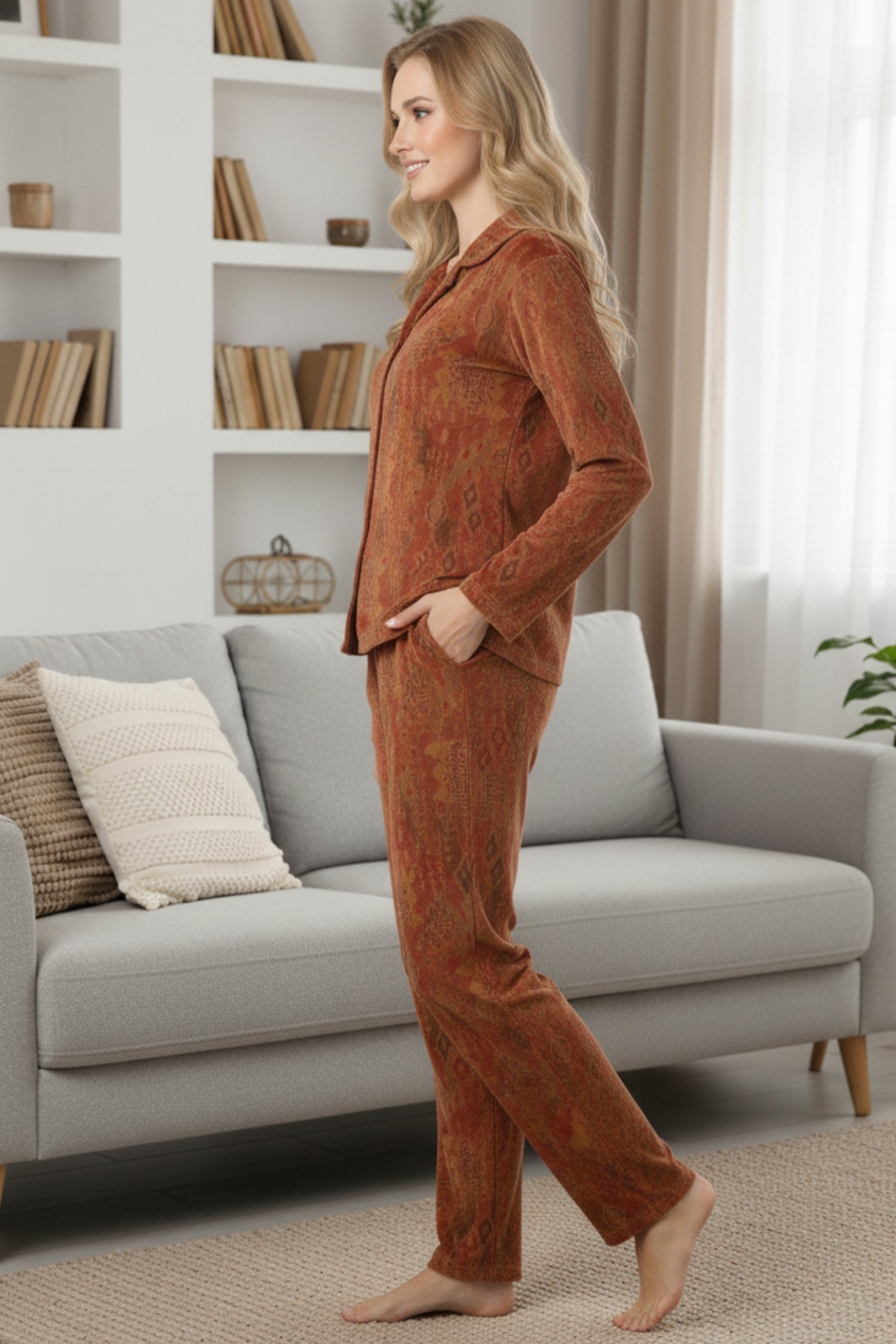 Elevate your loungewear style with the Fablush Women’s Front Open Full Sleeves Nightsuit (Style FB37008). Crafted from ultra-soft printed velour fabric, this nightwear set delivers luxurious comfort with a rich, velvety touch that keeps you warm and stylish all night long.
