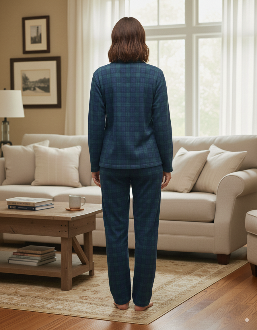 Stay warm and stylish with the Fablush Women’s Front Open Full Sleeves Nightsuit (Style FB37003), designed in cozy brushed flannel checks and bonded with soft fur for extra comfort. The classic notch collar top pairs perfectly with the relaxed flared pant, making it your ideal winter nightwear.