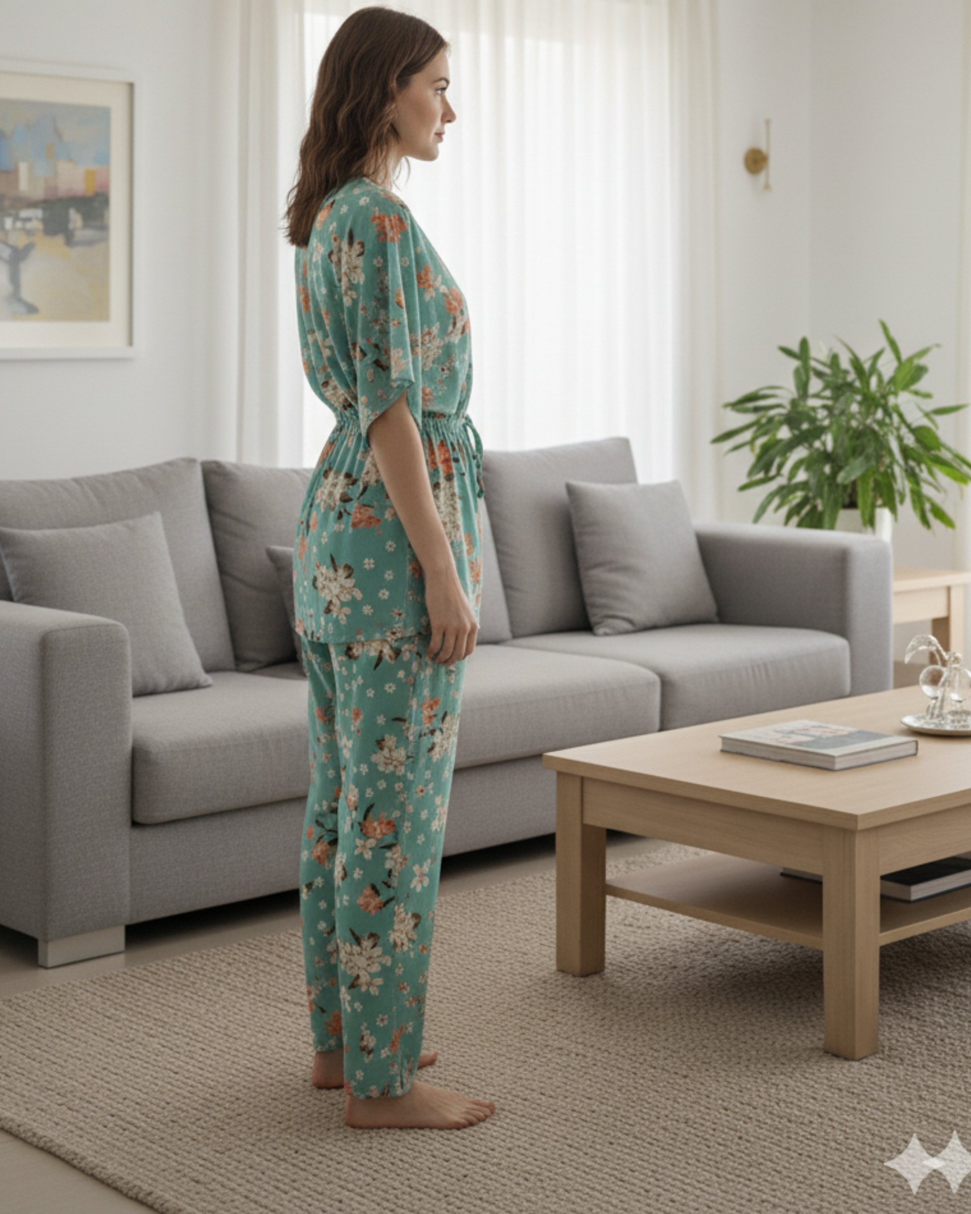 Unwind in style with the Fablush Women's Short Kaftan Nightwear, crafted from a premium Luxe Satin, viscose, and lycra blend. Featuring a breezy fit, stylish prints, and a soft, breathable feel, this kaftan set ensures maximum comfort for lounging and sleeping. Elevate your nightwear collection with effortless elegance.