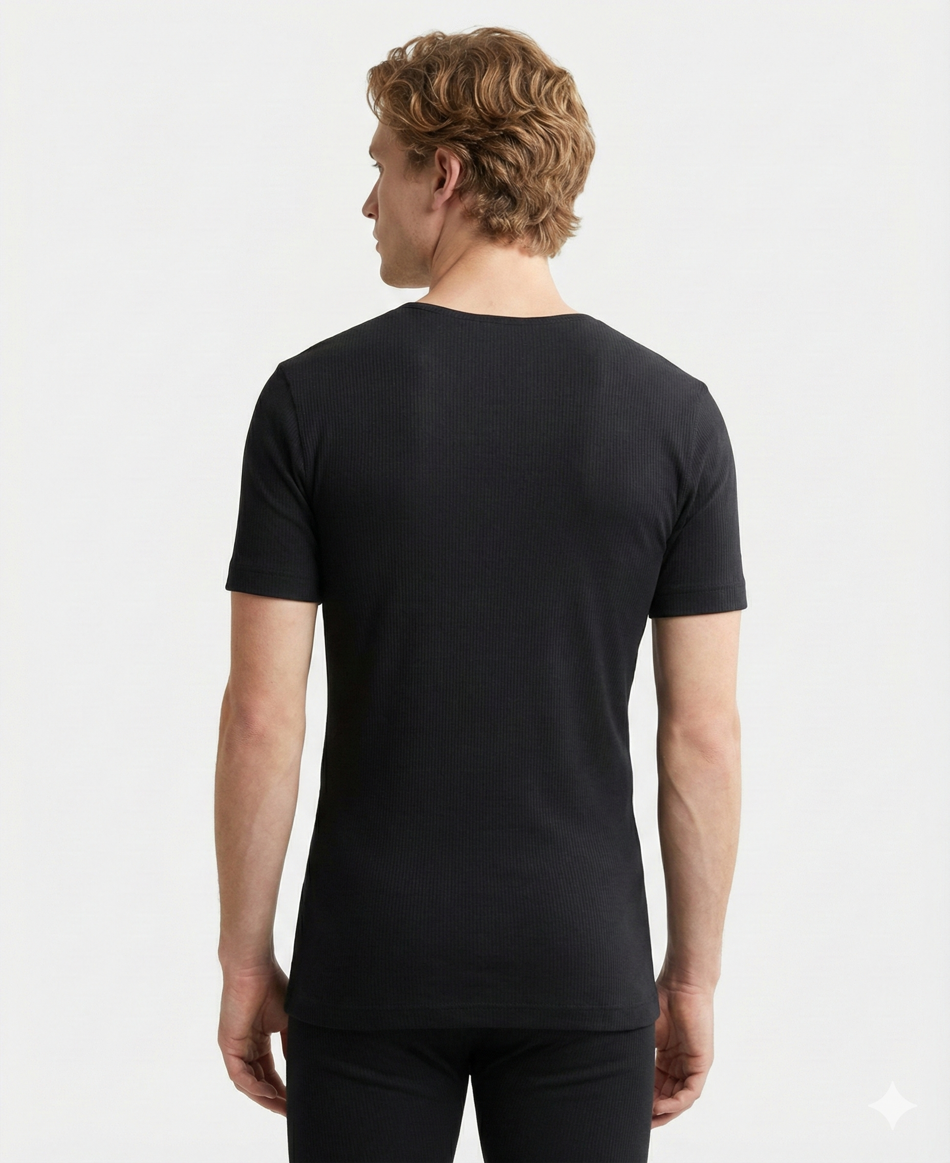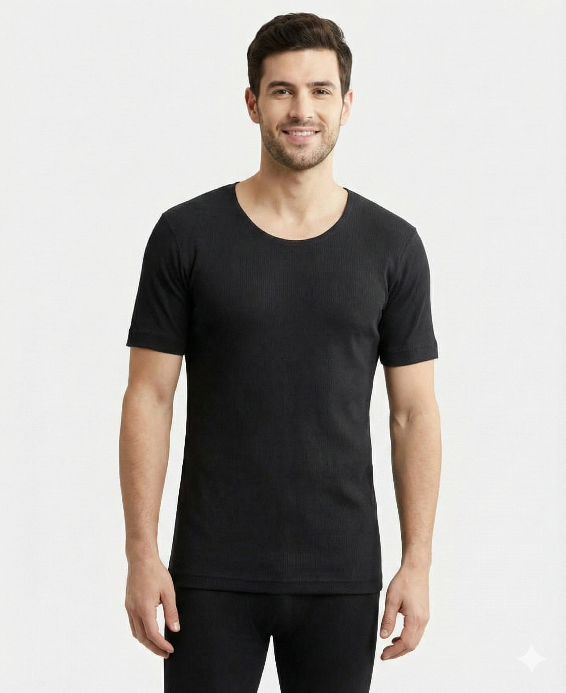 Crafted with a cotton-rich thermal knit fabric, it helps retain body heat while allowing natural breathability to prevent discomfort. The classic round-neck design and half sleeves make it ideal for everyday winter wear, travel, and outdoor activities.